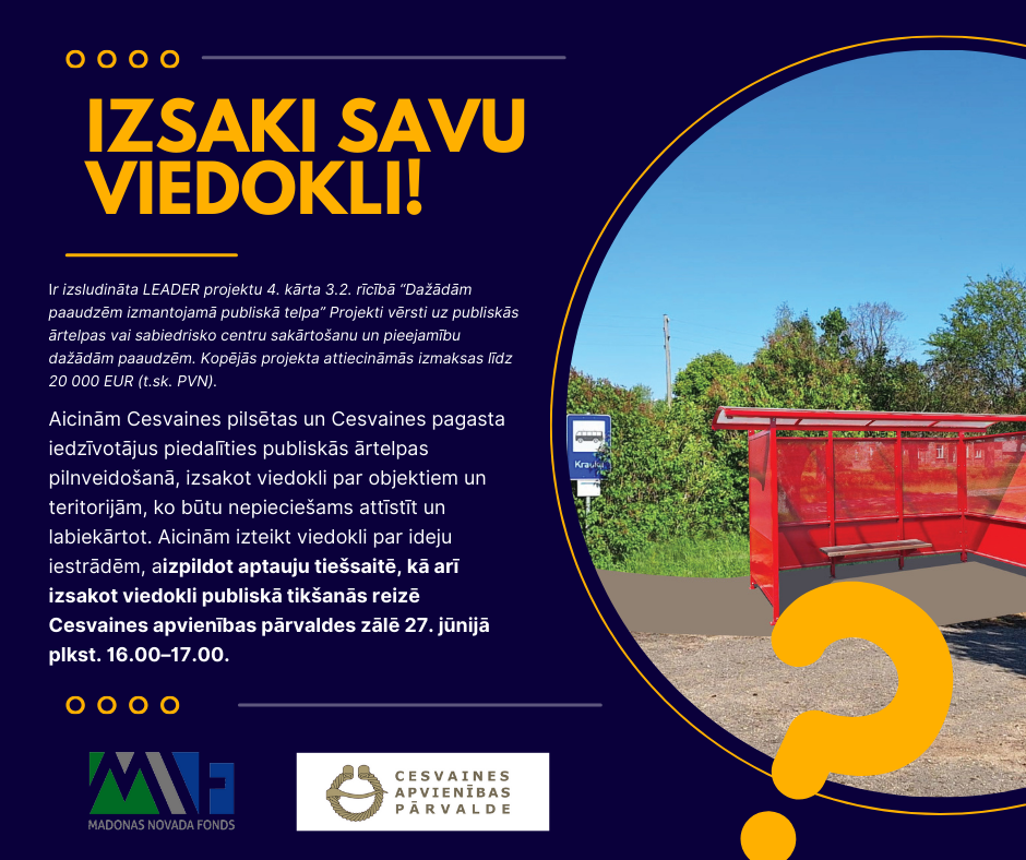 Cesvaines apvienības pārvaldei ir vairākas ieceres vides uzlabošanai. Aicinām izteikt viedokli par iecerēm, kā arī izteikt savas idejas, ko būtu vēlams uzlabot vai sakārtot Cesvaines pilsētā vai Cesvaines pagastā