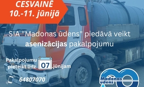 SIA “Madonas ūdens” plāno sniegt asenizācijas pakalpojumu Cesvainē šī gada 10.-11. jūnijā un aicina pieteikties pakalpojumam līdz 07. jūnijam, darba laikā zvanot 64807070 un izvēloties runāt ar dispečeru.