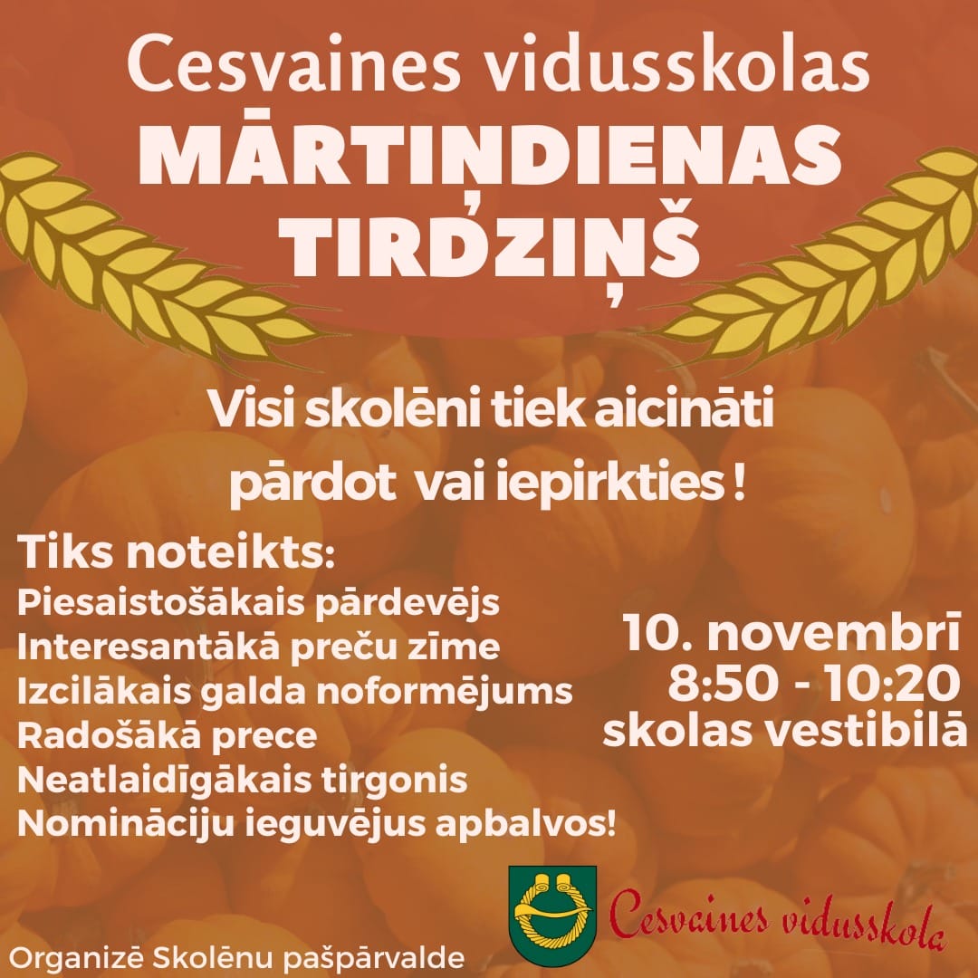Ja esi Cesvaines vidusskolas skolēns, skolotājs vai darbinieks, nāc, atrodi vietu pie galdiem, kas 10. novembrī būs nolikti vestibilā un pārdod preci, vai izvēlies iepirkties no liela un raiba piedāvājumu klāsta! Jautājumu gadījumā, Skolēnu pašpārvaldes prezidents Jēkabs Āboltiņš - 24424322 - atbildēs gan uz zvaniem, gan īsziņām. Gaidīsim!