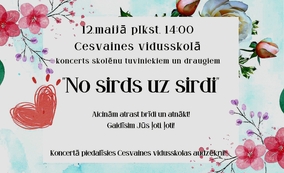 Mēs, Cesvaines vidusskolas saime, 12.maijā plkst. 14.00 aicinàm skolēnu vecākus, tuviniekus un draugus uz koncertu "No sirds uz sirdi".