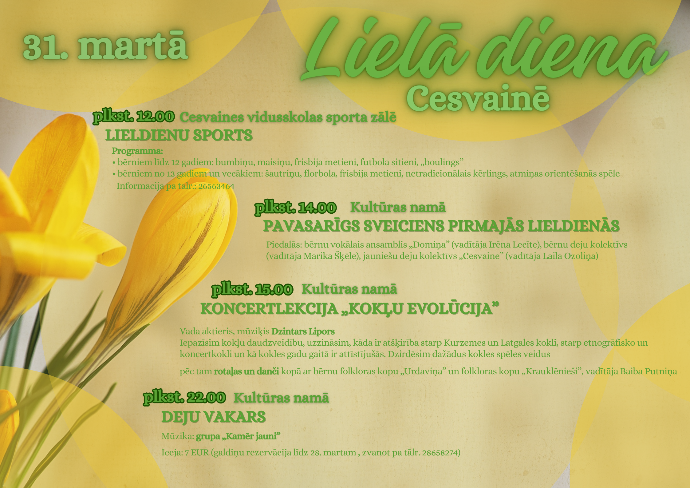 31. martā LIELĀ DIENA CESVAINĒ plkst. 12.00 vidusskolas sporta zālē LIELDIENU SPORTS Programma • bērniem līdz 12 gadiem: bumbiņu, maisiņu, frisbija metieni, futbola sitieni, „boulings” • bērniem no 13 gadiem un...
