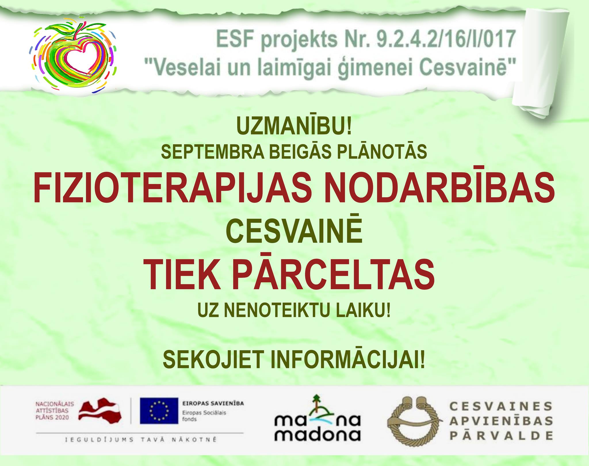 No mums neatkarīgu apstākļu dēļ, fizioterapijas nodarbības Cesvainē tiek pārceltas, bet satraukumam nav pamata - BŪS VĒLĀK!