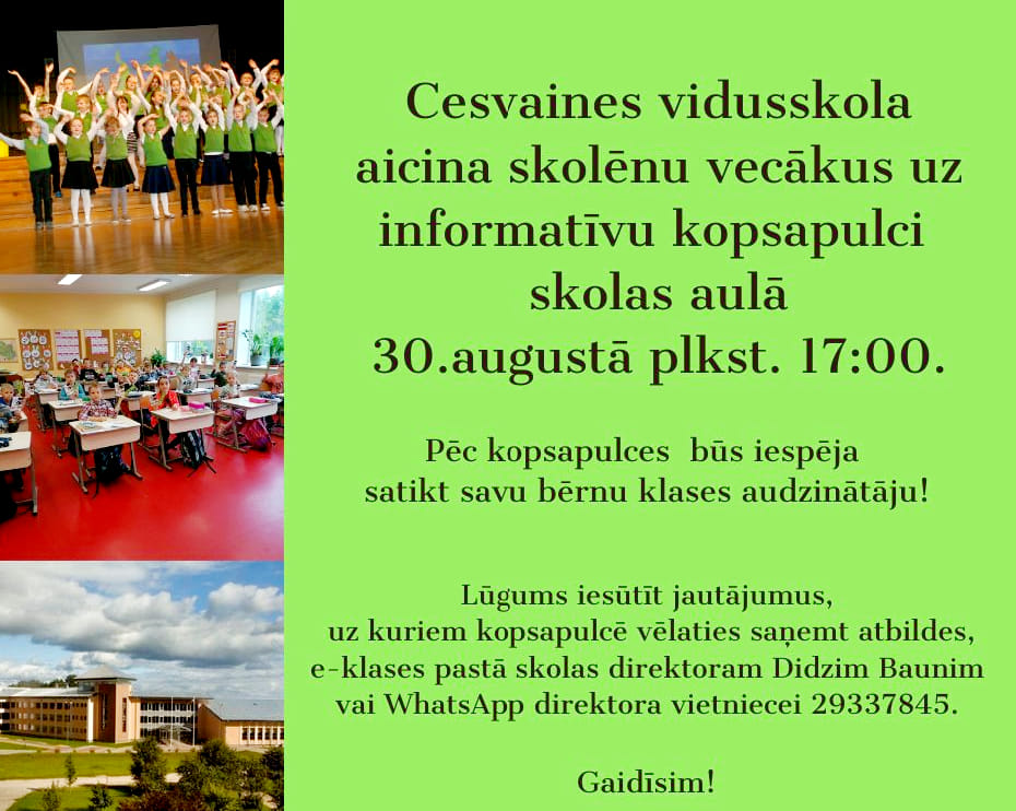Aicinām skolēnu vecākus uz informatīvu kopsapulci skolas aulā!