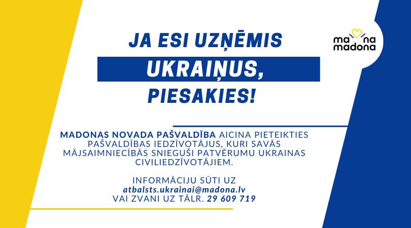 Atgādinājums: pašvaldībām ir jāreģistrē katrs novada teritorijā no Ukrainas ieceļojušais pilsonis, pat tad, ja no pašvaldības šī persona palīdzību nav lūgusi. Ja jūsu rīcībā ir informācija par Ukrainas bēgļiem (arī tiem, kurus pie sevis izmitina tuvinieki, draugi), lūgums nekavējoties sazināties ar informācijas koordinatoru Madonas novada pašvaldībā pa tālruni: 29609719.