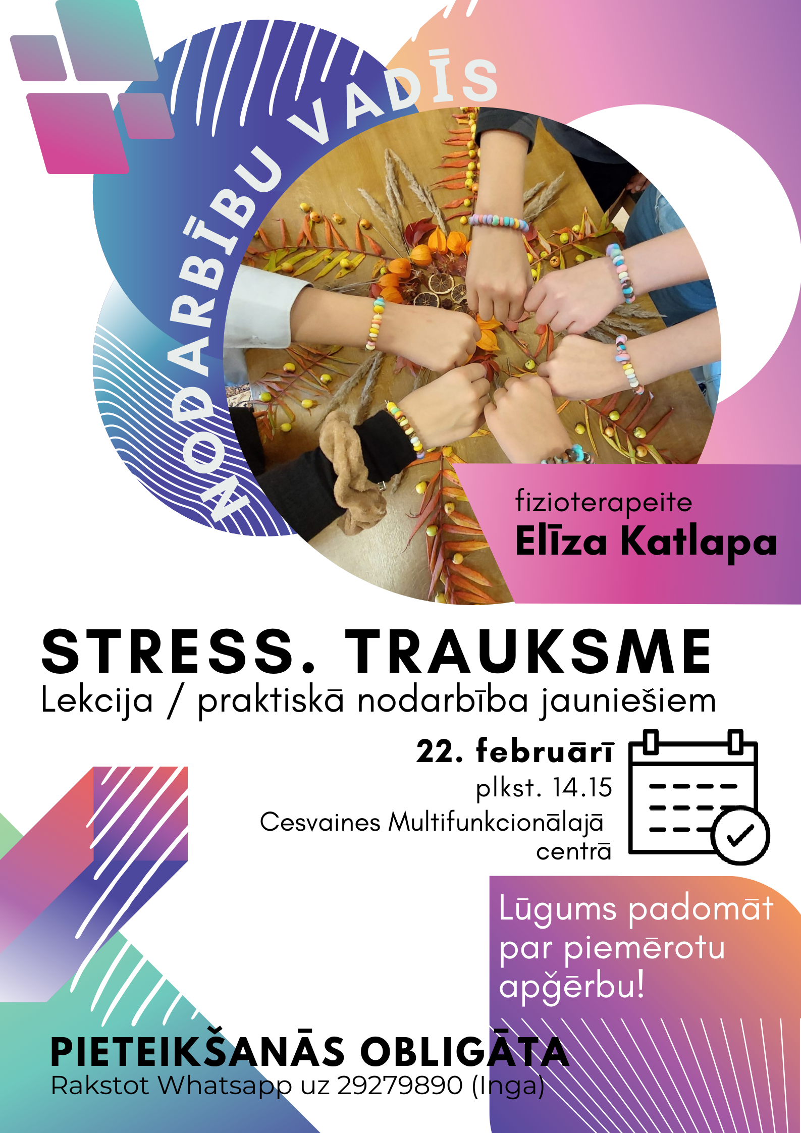 Aicinām uz praktisko nodarbību jauniešiem par stresa mazināšanu Cesvaines Multifunkcionālajā centrā 22. februārī plkst. 14.15! Nodarbību vadīs Elīza Katlapa. Pieteikšanās obligāta