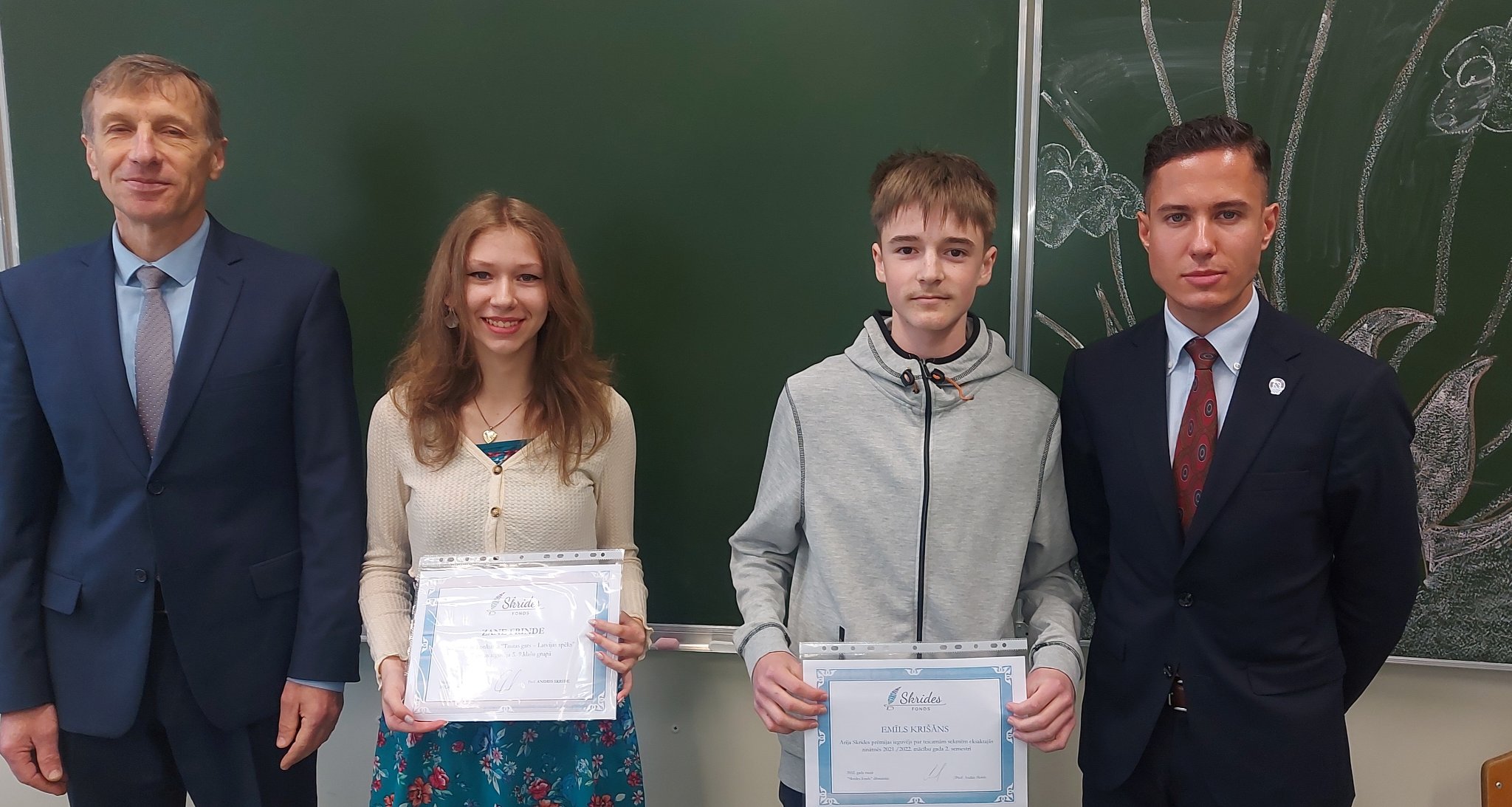 Patiess prieks par 8.b klases skolēnu Emīlu Krišānu un 12.klases skolnieci Sabīni Zani Cimušku, kuri skolas pēdējā dienā saņēma Skrides fonda prēmijas par sasniegumiem mācību darbā! Lai saņemtu prēmiju skolēniem jāuzrāda augsti mācību rezultāti eksaktajos mācību priekšmetos.