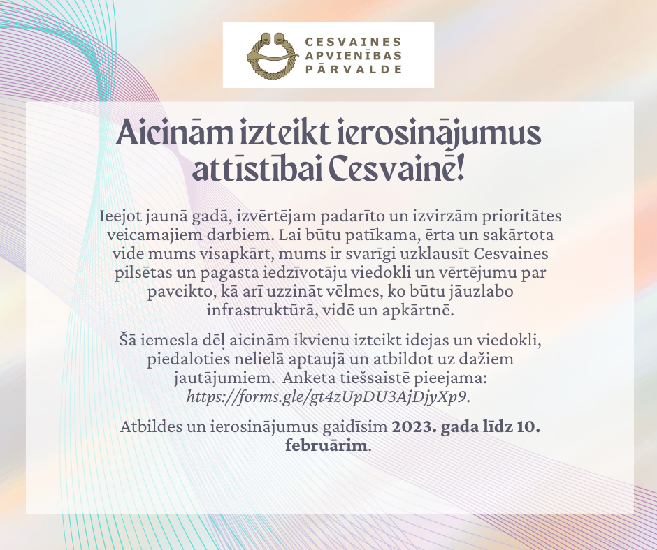 Ieejot jaunā gadā, izvērtējam padarīto un izvirzām prioritātes veicamajiem darbiem. Lai būtu patīkama, ērta un sakārtota vide mums visapkārt, mums ir svarīgi uzklausīt Cesvaines pilsētas un pagasta iedzīvotāju viedokli un vērtējumu par paveikto, kā arī uzzināt vēlmes, ko būtu jāuzlabo infrastruktūrā, vidē un apkārtnē.
